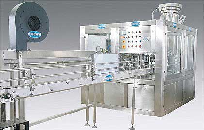 OPERATION : 1. BOTTLE IN-FEED & RINSER SECTION :The in-feed star wheel has spring loaded neck gripper fingers, which compensates for minor variation in bottle-neck diameter. The bottles fed by air conveyor are picked by fixed size neck star neck and transferred between grip fingers. This eliminates the need of feed worm and change parts for different sizes of bottle body diameter. The neck spider transfers the bottles on to rinsing turret, which has neck gripping fingers to carry the bottle around rinsing. The spray nozzles have No Bottle – No Rinsing spray mechanism, which saves water. The rinsing takes place during 90 degree rotation of turret. Thereafter for next 90 degrees bottles are tilted back by small angle to give adequate draining time.