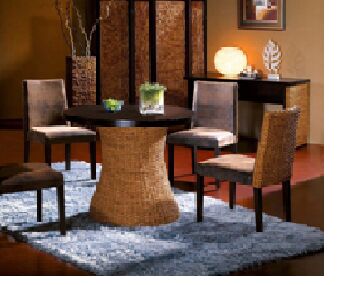 We are offering Dining set ( 4 armless chair, 1 table, 1 desk and 1 screen) Armless chair with cushion 45x58x85 Table with glass Φ90x73 2 Drawer Desk 120x55x75 Screen 160x180x3.5 Material: Water hyacinth Rattan Acacia wood Cotton fabric PU foam