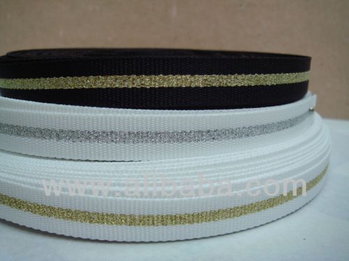 We are offering webbing tape. Color: white and black with gold and silver stripe product type webbing material polyester / nylon use bags, garment, home textile, shoes, decoration place of origin taiwan