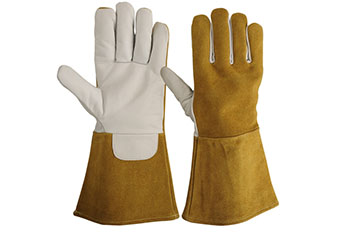 NNatural cow grain leather palm and thumb. Back & gauntlet style 15cm cuff with dyed split leather with edge hemming or binding. Extra pulse protection. Other cuff lengths available (8cms – 25cms). Full / Half cotton inner lining