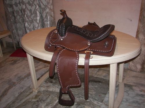 We offer western saddles. Reinforcements and quality about western leather saddles: Tree Quality : Fibre tree , WR mat Leather Quality : Cobracho oiled leather Softy : Buff softy Seat Material : Leather suede Fittings : Iron & brass Silver fittings : Brass with electroplated laquer Stirrups quality : wooden with iron plates Reinforcements: nylon tapes stitched on back billets and fenders straps. Rivits with both side washers.