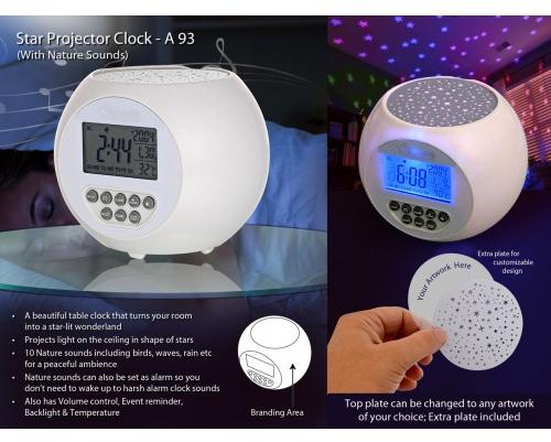 It is a beautiful Table clock that turns your room into a star-lit wonderland. It projects light on the ceiling in shape of stars, It has 10 Nature sounds including birds, waves, rain etc for a peaceful ambience, and that sounds can also be set as alarm so you don't need to wake up to harsh alarm clock sounds, and also has Volume control, Event reminder, Backlight & Temperature. It has a huge branding area for you promotional activities.