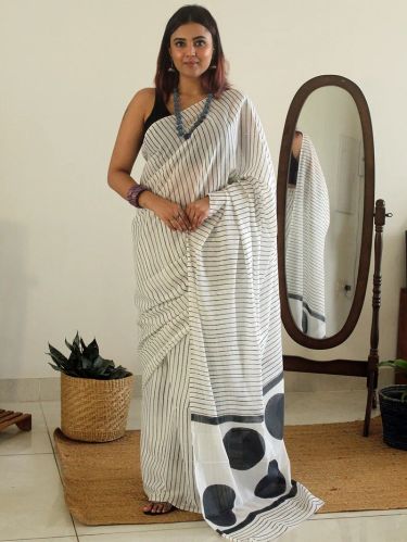 Contact SupplierBagru Dabu hand block printed pure mul cotton saree with stripes. Pure mul cotton. Length: 6.32 mtrs including blouse piece. (5.44 mtrs Saree) With: 44 inches. Blouse piece length: 88-89 cms. Naturally hand dyed and hand block printed. Washing and care Hand/ machine wash with like colours in cold water. Do not soak. Line dry in shade. Disclaimer: All images have been taken in daylight. The colours are closest to the actual colour of the saree, however, slight variation in the tone/shade made be noticed due to camera exposure setting and viewers display settings.