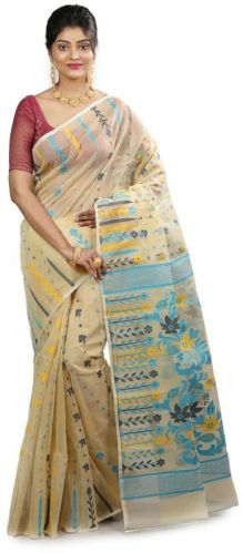 This is an off white coloured dhakai jamdani saree with multi coloured thread works. The entire body of the saree is woven in small butis and spade like motifs in longitudinal pattern. The pallu of the saree has a beautiful dense floral design. This simple yet elegant saree is perfect for everyday work wear.