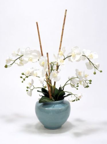 7533# - White Phaleonopsis Orchids, Arrorog Rattan in Blue-Cream Ceramic Vase Container Material Porcelain Dimensions Height" x Width" x Depth" 32 x 25 x 20 Dominant Color White Dominant Color Family Neutrals Shipping Weight 15 Ships