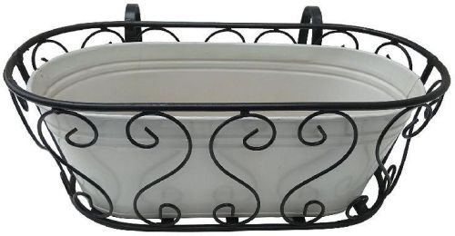 Wrought iron railing planter,with a colonial twist. Ideal for your seasonals, flowering perennials and foliage plants. Hook it on to your railing, window grill or fence, and for some old worldelegance and charm. The planter comes with a GI-metal planter and a 3 inch hook for easy hanging. Iron window box size 15.5 x 7 x 6 into inches (LxWxH) metal planter size 14 x 6 x 5 into inches (LxWxH) hook size is about 3 inches.