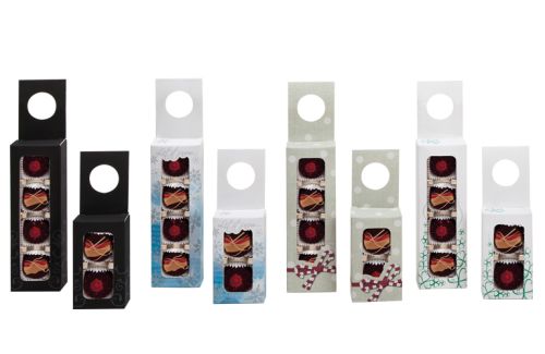 The perfect solution to pair truffles with . Candy box hangs flush on a bottle for the perfect gift presentation and retail friendly. Our unique design comes complete with truffle tray. Available in 2 pc. and 4 pc. in a variety of patterns and solid colors. Shown in black vine, Let it Snow, Candy Ribbon and Shamrocks.