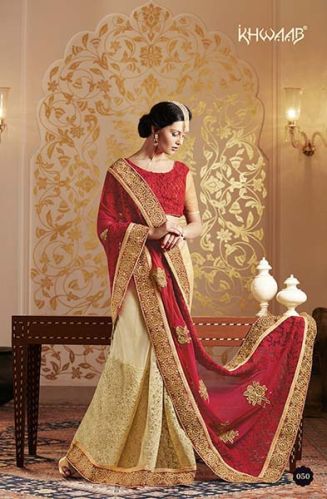 DDESIGNER EMBROIDERED RED & CREAM GEORGETTE & NET PARTY WEAR SAREE?