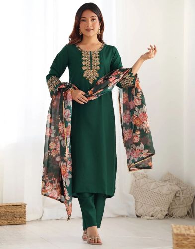 Contact SupplierWe offer a Women Embroidery Straight Dark Green 3 Piece Suit Set in sizes ranging from S to 4XL, perfect for formal occasions. This 3-piece suit set includes a Kurta, Top, and Bottom made of Roman fabric, with an Organza Dupatta. The Top features elegant Embroidery Work, while the Dupatta showcases beautiful prints. Designed with a Regular styling, Three Quarter Sleeves, and a Round Neckline, this suit set is ideal for business categories like Exporters, Suppliers, and Traders. Elevate your wardrobe with this sophisticated and versatile ensemble.