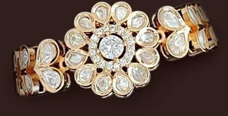 This elegant bracelet, crafted in high gold, showcases a mesmerizing floral motif adorned with sparkling American diamonds. The intricate petal design beautifully captures the light, giving it a radiant and sophisticated appeal. Perfect for both festive occasions and modern-day glamour.