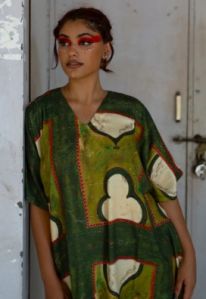 GARMENT DETAILS Antifit calf-length dress with pockets V neckline Boxy sleeves Slit at the centre- back for ease in walking Please Note: Print placement may vary for every product. Shipping: 10-12 business days FABRIC COMPOSITION Slub cotton viscose Lightweight ABOUT THE PRINT Handmade artworks are digitally printed onto the fabrics PRINT: Inspired from the French playing cards, the motifs in white 'Spade & Clubs' intermingle in poster colours on a lavish sap green backdrop.