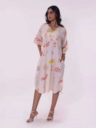 This relaxed fit printed dress features a v neck with long elasticated sleeves and a comfortable midi length. It has self-empowering quotes all over, making it a unique outfit for any occasion! GARMENT CARE: Make me a forever piece! Dry clean or mild hand wash only. Refer to the care label for more instructions Note: Due to differences in screen, the colour of the outfit in this picture may vary slightly from the actual colour. Since it’s a print, placement of the print on the outfit may vary, making every piece unique