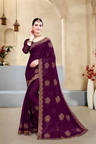 Chiffon: The saree is crafted from chiffon, a lightweight and sheer fabric. Chiffon is often made from silk, polyester, or a blend of synthetic fibers. It has a soft and slightly textured surface, providing a graceful drape.