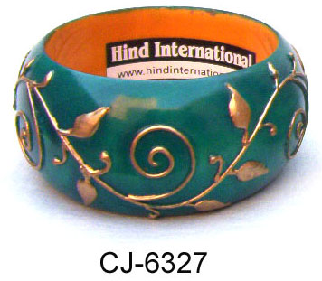 Very beautiful and enchanting handmade, embossed and hand painted wooden bangle in green & golden colour. The inner diameter of the bangle is 65 mm; the breadth of the bangle is 3.75 cms 1.50 inches