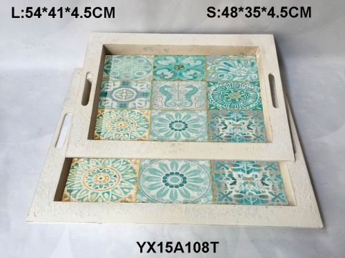 We offer wooden tray. Printed paper tile pattern inside rect wooden handle tray.it is crafted with delicate patterns for added style.