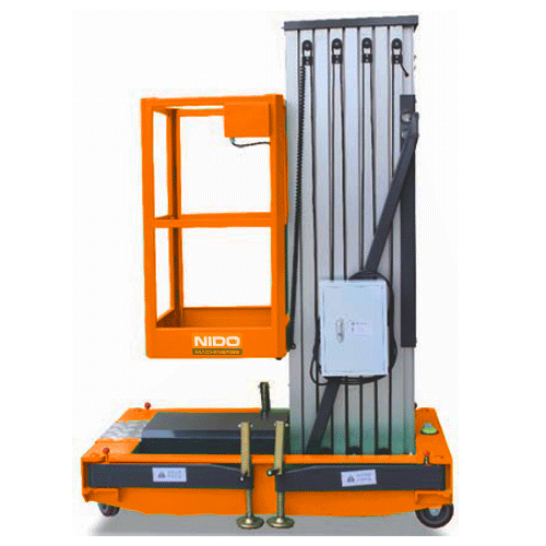 NIDO mobile aerial work platoform used for single person maintenance purpose with the maximum platform height of 6,8,9 & 10 mtrs.Platform and Ground Control,Auxiliary Lowering Device,Emergency Stop Button Anti-burst System,Big Level Gauge Limit Switches,Screw Type Outriggers Short Circuit & Leakage Protection System.