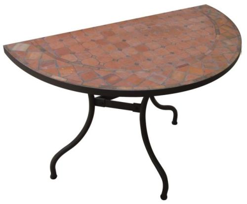 We are offering wrought iron consoles, ceramic mosaic half moon console. finish: wrought iron table base, tube iron, knock down system, antirust treatment, powder coating. Terra cotta mosaic table top, water proof treatment. Use only one, two to form the round table or lengthen the rectangular table. dimension: console table top 90*45cm, height 74cm.