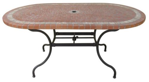 We are offering wrought iron dining table triqui 12. finish: wrought iron table base, tube iron, knock down system, antirust treatment, powder coating. Terra cotta mosaic table top with beige glazed ceramic lozenge, water proof treatment. With the hole and parasol base system.