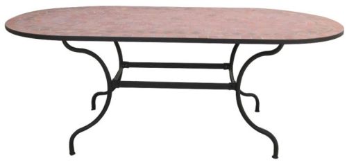 Finish: wrought iron table base, tube iron, knock down system, antirust treatment, powder coating. Terra cotta mosaic table top, water proof treatment. Dimension: table top 180*90cm, height 74cm.