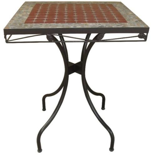 Finish: wrought iron table base, tube iron, knock down system, antirust treatment, powder coating. Red glazed ceramic mosaic with beige border table top, water proof treatment. Dimension: square table top 60*60cm, height 74cm.