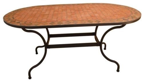 Finish: Table base : Wrought iron table base, tube iron, knock down system, antirust treatment, powder coating. Table top :Terra cotta mosaic table top with terra cotta lozenge, water proof treatment.