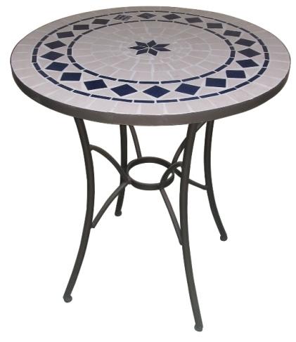 finish: wrought iron table base, tube iron, knock down system, antirust treatment, powder coating. white glazed ceramic mosaic with blue border table top, water proof treatment. dimension: round table diameter ΓΈ = 60cm, height 74cm.