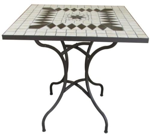 We are offering wrought iron table triqui 14. finish: wrought iron table base, tube iron, bendable system, antirust treatment, powder coating. White glazed ceramic mosaic with black border table top, water proof treatment. dimension: square table top 60*60cm, height 74cm.