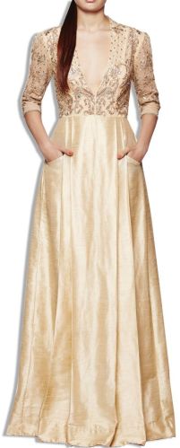 An elegant woman gown embellised with golden beads sequins and crystal with polyester dupion shantoon lining.