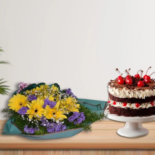 Our perfect combo of yellow gerbera bouquet and a choice of cake among chocolate, black forest, white forest, and pineapple cake. Send this special combo to someone special on their birthday, anniversaries, Valentine’s, new year, or any other important day to make it even more special. PRODUCT INFO Flowers bouquet: Yellow Gerbera,White gypsy & Purple Daisy Choice of cake among chocolate, black forest, white forest, and pineapple cake