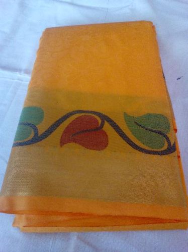 We offer Soft Embossed plain yellow color saree small border with beautiful leaf design attached blouse suitable for all functions.