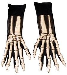 Cool latex skeleton detailing on upper hand and wrist attached to black gloves for ease of movement. These do not glow. Horrific look! One size fits most adults.