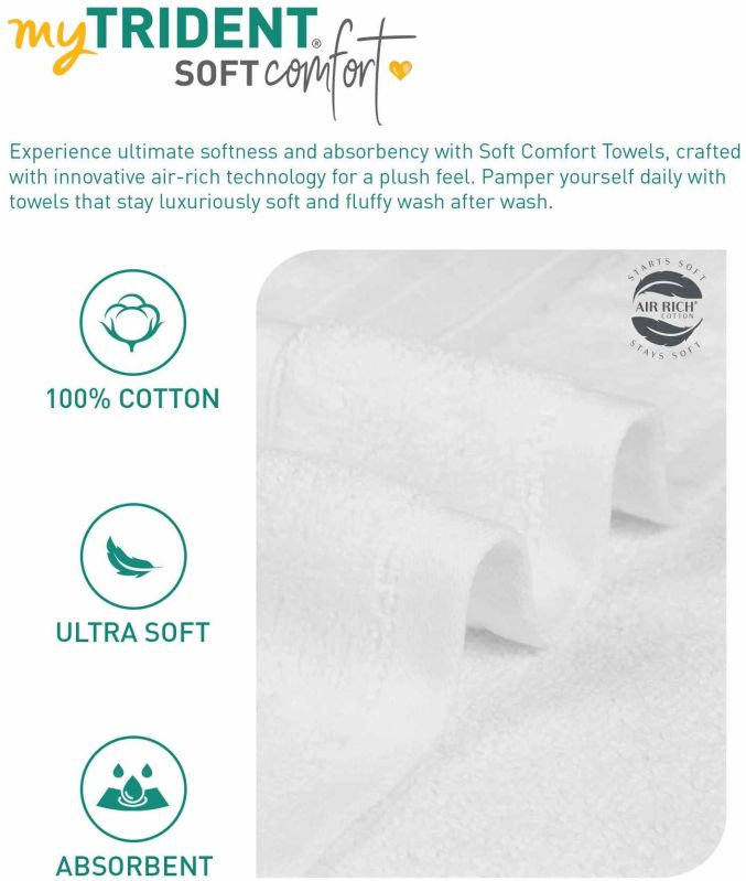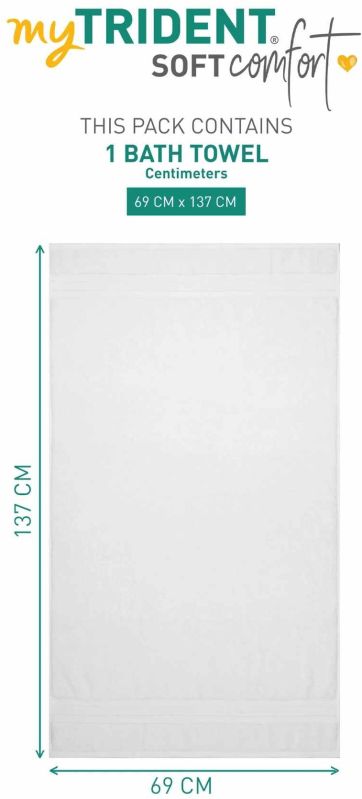 We offer the My Trident White Cotton Bath Towel, a luxurious addition to your bath experience. Crafted from high-quality 827 GSM cotton, this 30x60 inch towel boasts high absorbency for quick drying. The solid pattern and white packaging exude elegance, perfect for any bathroom decor. Machine washable for easy care, this bath towel from My Trident is a must-have for your daily routine. Whether you're a supplier or trader, elevate your product offerings with this premium bath towel.