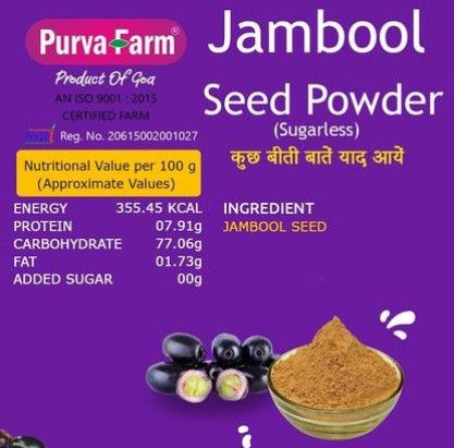 Jambool Seed Power made from Organic Farm Fresh Agricultural Friut Jambool. It is ready to Used. One Teaspoonful is mix with 200 ml warm water mix it & consume. Helps to reduce sugar of diabities person. Product of Goa State. Its surgarless