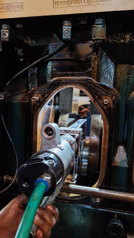 RA Power Solutions, with 43 years of experience, has introduced a mobile service for machining of crankshafts and cylindrical shafts onsite. The failure of a compressor, pump, engine, or crankshaft in any reciprocating equipment can lead to extremely high costs and tremendous downtime. The introduction of mobile in situ machining services by RA Power Solutions eliminates the high cost of repairs and saves time by avoiding the need to disassemble, remove the shaft, and transport it to the designated workshop. The machining services for all types of cylindrical shafts and crankshafts up to a diameter of 700mm are extended maintaining the tolarances as per the manufacturers requirement. | Hardness Test of Crank Pin MAN B&W 5L16/24 Engine | Onsite Crankshaft Grinding and Polishing Under Process |