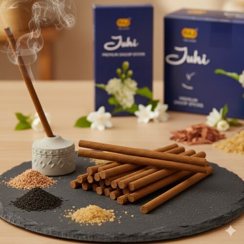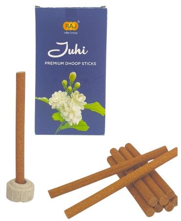 JUHI DHOOP A soft, sweet floral fragrance inspired by blooming juhi flowers. This gentle aroma refreshes the air, uplifts the mood, and brings a touch of natural beauty to any space. Let the enchanting fragrance of juhi blossoms fill your surroundings. Elegant and delicate, this dhoop evokes the charm of a moonlit jasmine garden.The soul-soothing scent of juhi invites harmony and emotional balance. Light a stick to experience serenity, sweetness, and floral freshness in every breath.