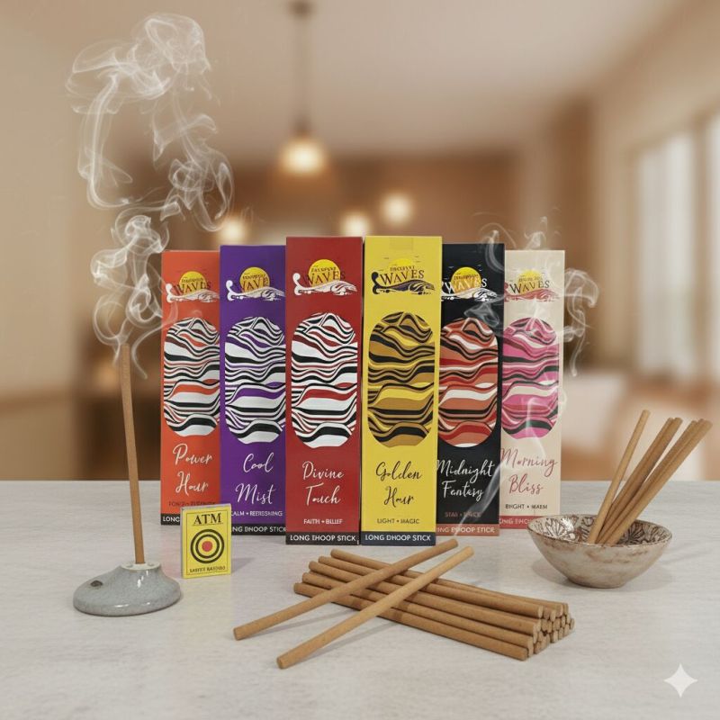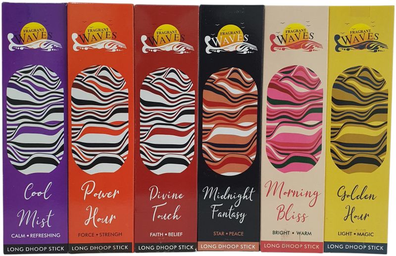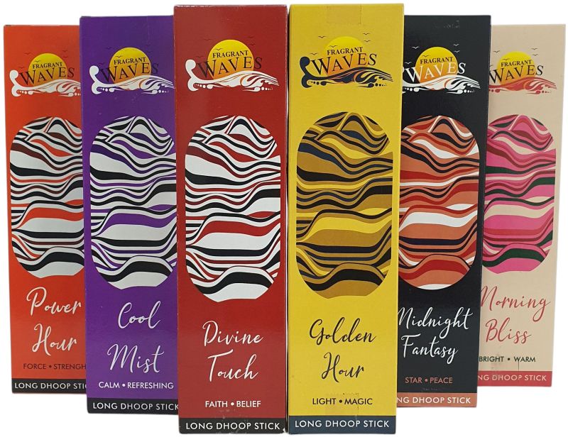 Fragrant Waves 6 in 1 Dhoop Collection Immerse yourself in a wave of captivating aromas with the Fragrant Waves Dhoop Collection, a thoughtfully curated set of six unique fragrances designed to uplift your mood, calm your mind, and transform your space. Each scent brings its own distinct charmperfect for every mood, moment, and occasion. This 6-in-1 collection includes: Morning Bliss A refreshing floral fragrance that awakens your senses and fills your day with positivity. Midnight Fantasy (Lavender) A soothing, dreamy scent that relaxes the mind and promotes restful sleep. Divine Touch (Sandalwood) A warm, spiritual aroma that invokes peace, devotion, and grounding energy. Cool Mist (Cool Waters) A crisp, aquatic fragrance that refreshes the atmosphere and revitalizes your mood. Power Hour (Vanilla) A sweet, comforting scent that inspires motivation and calm focus. Golden Hour (Golden Block) A luxurious, amber-toned fragrance that radiates warmth, harmony, and positivity. Key Features: Six premium fragrances in one versatile collection Crafted from natural herbs, resins, and essential oils Perfect for meditation, relaxation, prayers, or daily use Long-lasting aroma with a smooth, even burn Ideal gift for fragrance lovers and spiritual seekers Let every moment flow with fragrancediscover the perfect scent for every mood with the Fragrant Waves Dhoop Collection.