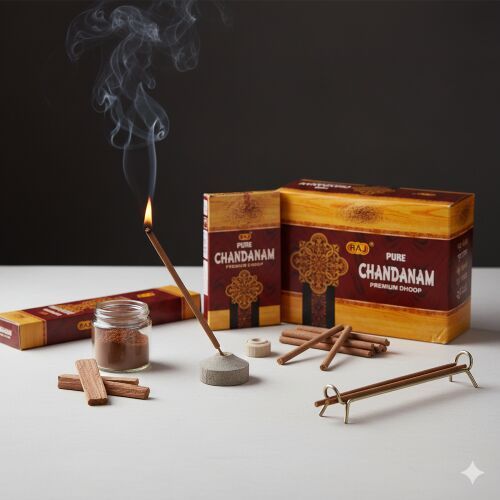 CHANDANAM DHOOP A luxurious blend of natural sandalwood powder, this dhoop creates a rich, velvety fragrance that lingers gentlyideal for creating a serene home or spiritual corner.Crafted from pure sandalwood, this dhoop releases a sacred aroma cherished in temples and homes alike. Ideal for prayer, meditation, and spiritual rituals.Rooted in Vedic tradition, the timeless scent of chandanam uplifts the soul and cleanses the aura. A perfect companion for sacred rituals or peaceful moments.