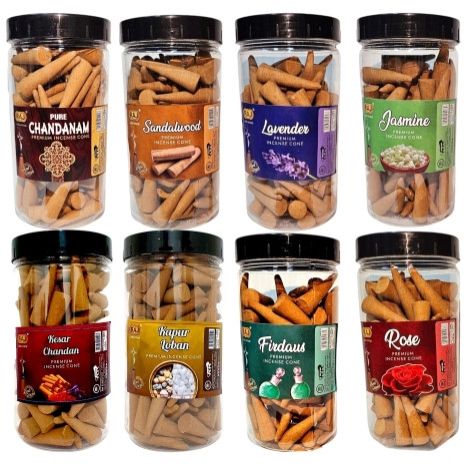 FIRDOUS - CONES Delicate hints of neroli, frankincense, and patchouli combine in this refined scent. Light a cone and fill your space with a pure, elegant fragrance that calms the mind and uplifts the spirit.An enchanting fusion of warm oud, sweet amber, and soft jasmine. Let the mystical aroma of these cones transport you to ancient sacred spaces filled with tranquility and grace. Packing Form: Jar Contents: 200g per jar M.R.P.: 125.00 per jar Unit Packing: 1 Jar per unit Carton Packing: 120 Jars per carton Total Quantity per Carton: 120 Jars Total M.R.P. per Carton: 15, 000.00 (120 125.00)