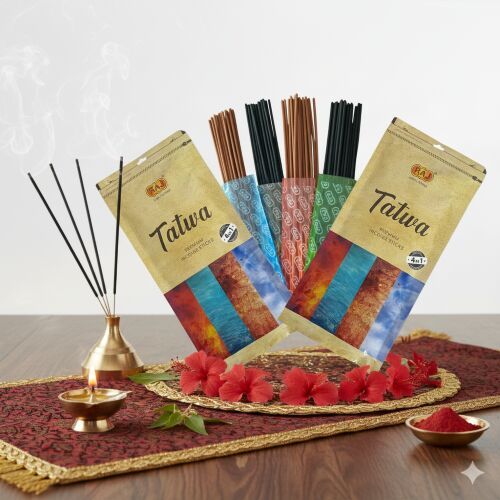" TATWA 4-in-1 White Bathi – Sandalwood Musk Cool Waters Ocean TATWA 4-in-1 combines four distinct and harmonizing aromas in a single pack, each offering a unique sensory journey. Rolled in white bathi style for a cleaner, softer burn with less smoke and a smoother fragrance release. 1. Sandalwood – Warm, creamy, and woody. A timeless scent that grounds the senses and purifies the atmosphere. Traditionally used for meditation and spiritual balance. 2. Musk – Deep, earthy, and slightly sweet. This rich, lingering fragrance adds a sensual warmth, perfect for unwinding or enhancing a cozy space. 3. Cool Waters – Fresh, crisp, and invigorating. Inspired by ocean breeze and clean air, this scent refreshes the surroundings with a modern aquatic tone. 4. Ocean – Salty, airy, and slightly floral. Evokes the expansive feel of sea spray and coastal winds—a calming scent that clears the mind and uplifts the mood."