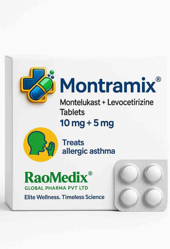 We offer Montramix Tablets, a powerful combination of Montelukast and Levocetirizine in 10mg and 5mg respectively, packed in convenient strips for easy usage. Manufactured by RaoMedix Global Pharma Pvt Ltd, these tablets effectively treat allergic asthma, providing much-needed allergy relief. As an exporter, supplier, and trader of pharmaceutical products, we ensure top-quality packaging and composition for optimal results. Trust Montramix for reliable allergy relief and experience the benefits of this trusted medication in a user-friendly tablet form.