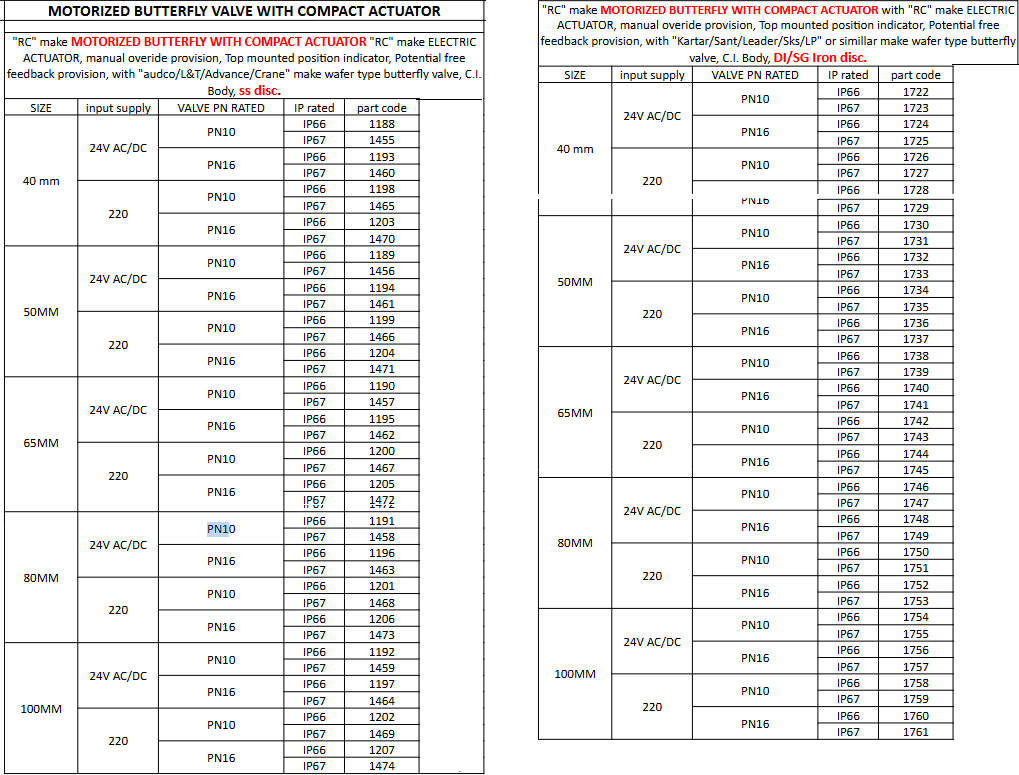“RC” make motorized butterfly valve comes with Quarter non-spring return compact electric actuator 24V AC/DC supply. The electric actuator has weather proof enclosure, so it can be easily installed in open air. The Actuator has rugged high strength tempered gear & super Efficient motor for providing countless operation.