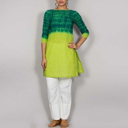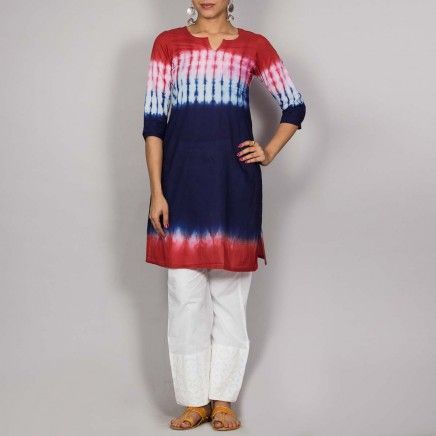 Shibori is a form of tie and dye in which the fabric is folded, pleated, tied or stitched in different ways and then dyed to achieve various designs. This process produces irregular patterns and colors in the garment, a natural outcome of the hand done work and adds to its beauty. Hence no two pieces are identical as in machine made products.