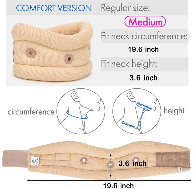 RCSP Cervical Collar supports the jaw and neck while limiting mobility to relieve pain and pressure in the spine. Realigning and stabilizing vertebrae, the soft foam collar can be worn throughout the day and while sleeping, it is for support and pain relief. The soft neck collar was designed with a long round closure allowing you to easily adjust it to find a perfect fit. The neck support brace is a popular choice for men and women to wear during the day and while sleeping. The soft cervical collar limits cervical motion, which is recommended whenever a reminder against making quick, painful neck movements is required. The neck support brace helps alleviate pain and provides support. Our universal neck brace for neck pain and support comes in various sizes for your convenience. Simply measure your neck and refer to the chart in the images to see which size works best for you. Latex-free double covered lycra is blended with composite yarn to make the material durable, breathable & skin-friendly. The product undergoes a special finishing process to make the material last longer and adding properties. This neck support is scientifically designed for comfort & stability. It provides warmth, support and limitation of movement. It is made from special PU foam and plastic for an anatomic fit. The air vents are provided for airflow. This neck support provides an immediate noticeable therapeutic relief to the neck.