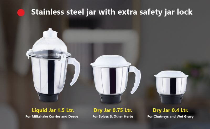 The Rico mixer grinder comes with 3 stainless steel jars: a liquidizing jar, a multipurpose jar, and a chutney jar.