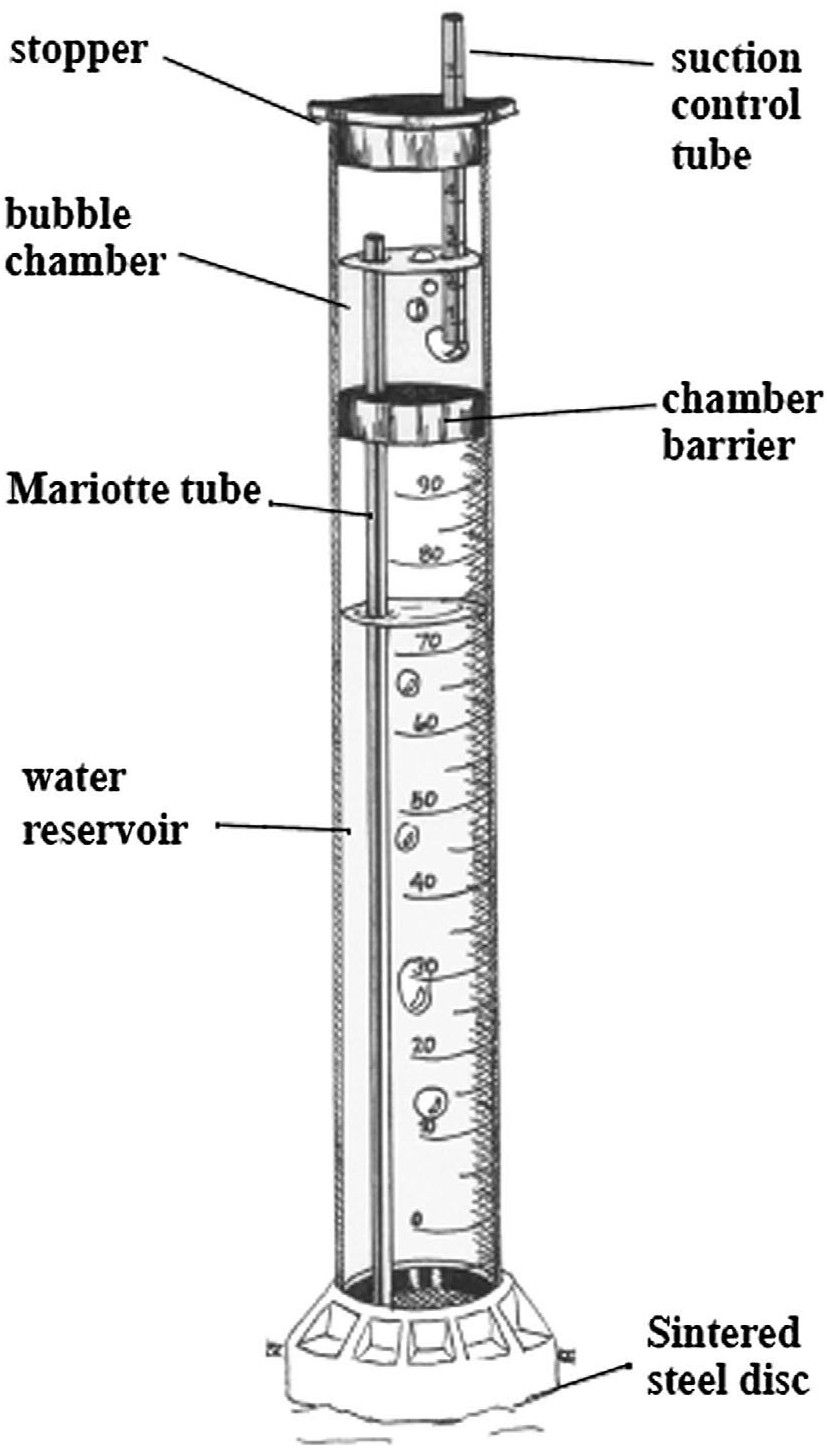 Tension infiltrometers are designed to measure the unsaturated hydraulic properties of soils. Water is allowed to infiltrate soil at a rate, which is slower than when water is ponded on the soil surface. This is accomplished by maintaining a small negative pressure on the water as it moves out of the infiltrometer disc into the soil.
