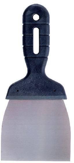 Stainless steel spatula 100 mm 100mm, plastic handle It is used for applying to large surfaces to be treated and subsequent leveling of putty and other finishing solutions. The profiled spatula blade is made of high-carbon stainless steel, which has undergone special heat treatment to give it the memory properties (when bending, the blade assumes its original position). The plastic handle is securely fastened to the sheet and equipped with a suspension hole.
