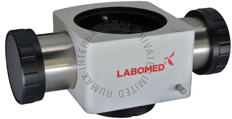 The beam splitter diverts a portion of the light to two secondary attachments such as the second observer tubes, video or digital cameras.
