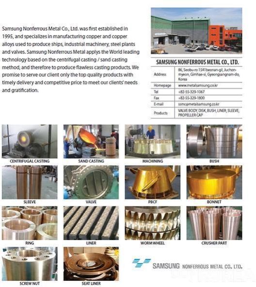 We established in 1995 and specializes in manufacturing copper and copper alloys used to produce ships, industrial machinery, plants, valves. We supplying copper alloy casting product to major company in Korea stably and we hold a patent regarding to centrifugal casting. Casting Method: Sand Casting, Centrifugal CastingMaterial: Red Brass, Yellow Brass, High-Strength Yellow Brass, Lead Tin Bronze, Aluminum Bronze, and all other copper alloys materials Maximum Product Size:Centrifugal Casting : Horizontal Type: Diameter : around 800 mm Length : around 4, 000 mmVertical Type: Diameter : around 1, 500 mm Length : around 500 mmSand Casting : Up to 20 tons per each Main Customer :Hyundai Heavy Industrials, Hyundai Rotem, Hyundai Wia, Doosan Heavy Industrials, others Main Product:Bush, Sleeve, Valve Body, Propeller Cap, Ring, Liner, Worm Wheel, Crusher Part(bush), Screw Nut, Seat Liner, else.
