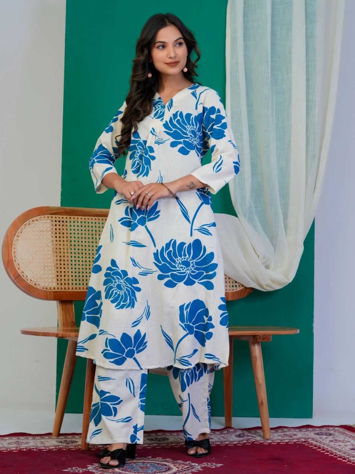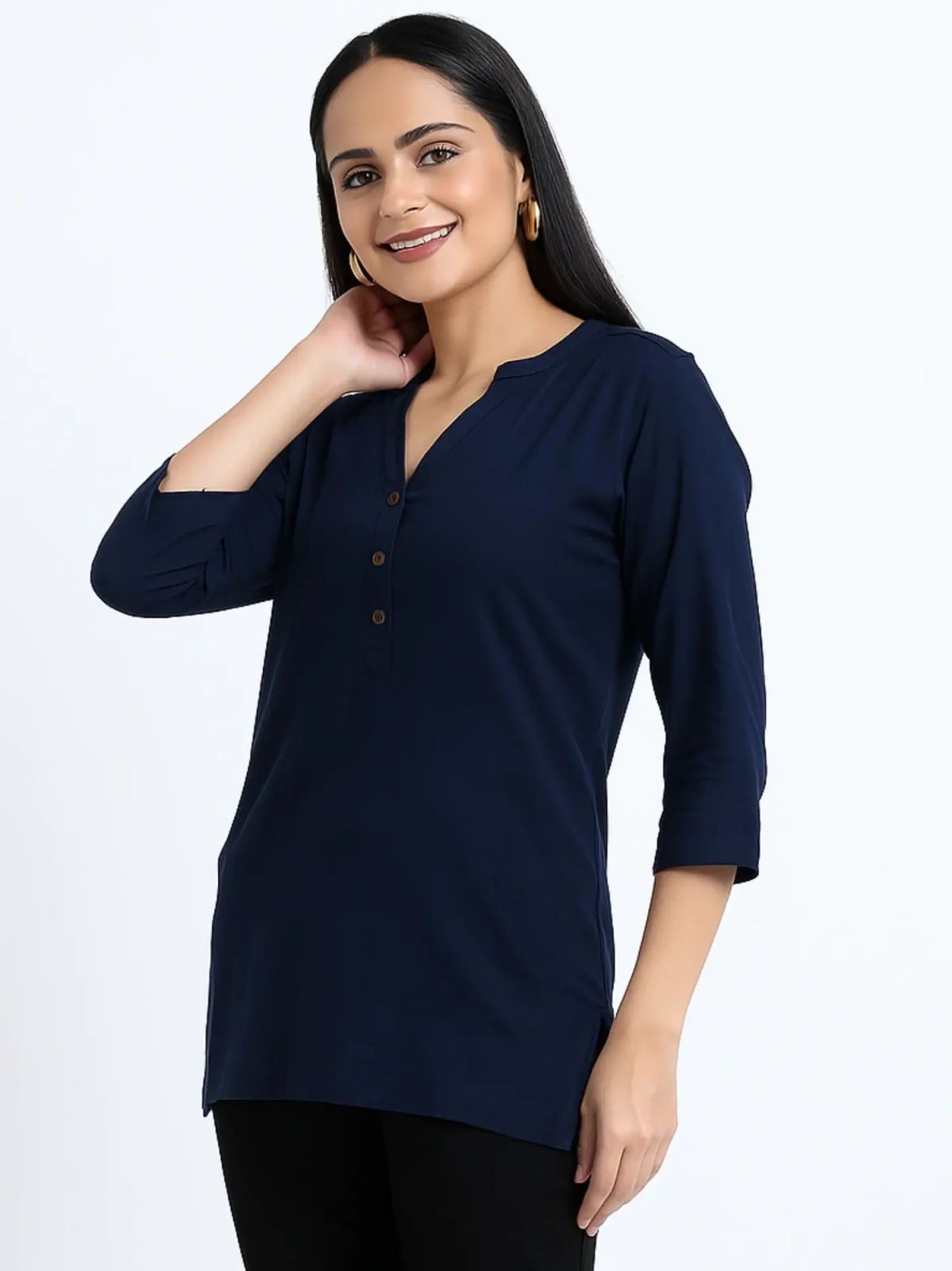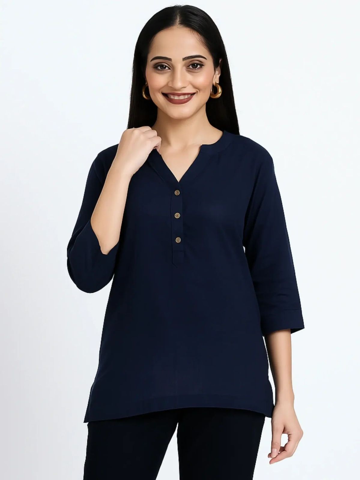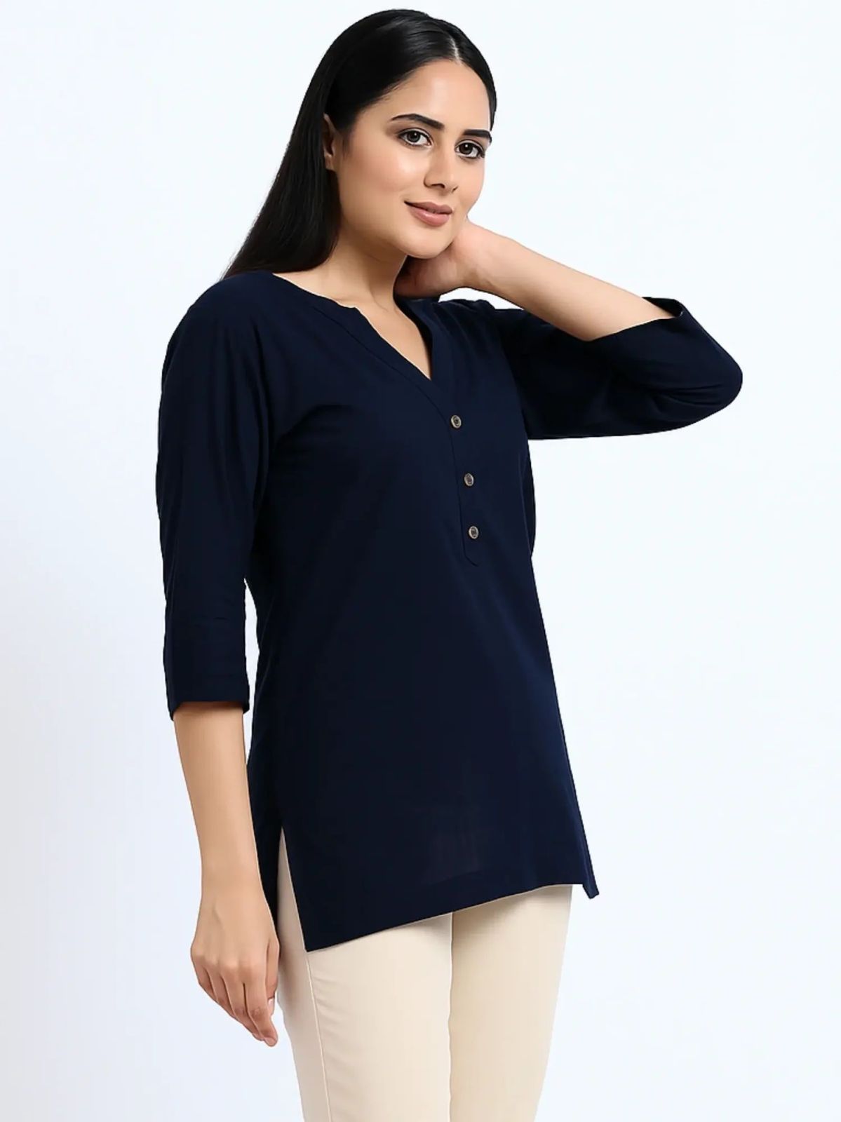 We provide a Navy Blue White Linen Cotton Short Kurta Pant Set in sizes ranging from S to 4XL. This set features an airy linen short kurta with cotton pant, designed for a regular fit. The kurta has 3/4th sleeves, a mandarin collar with 3 wooden buttons, and is made of 20% linen and 80% cotton. The cotton pant is mid-rise and made of 100% cotton. Perfect for formal occasions, this set is ideal for exporters, suppliers, and traders looking for high-quality clothing options.