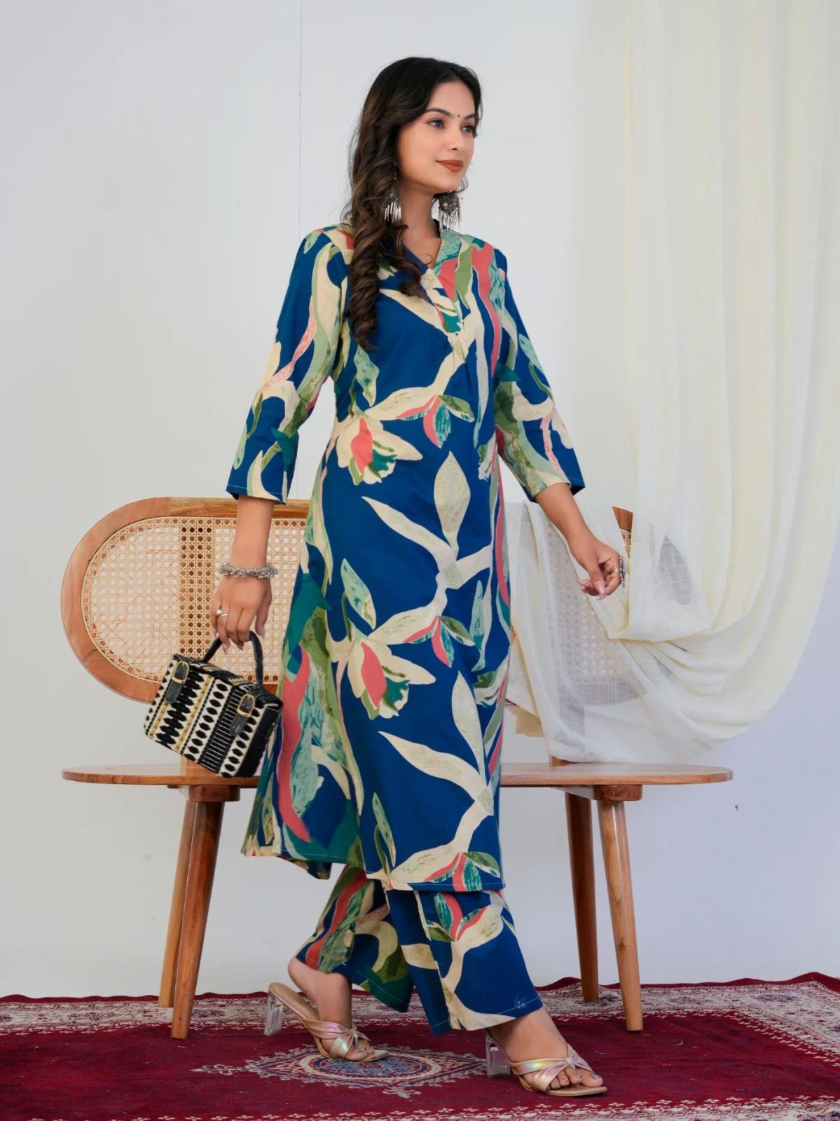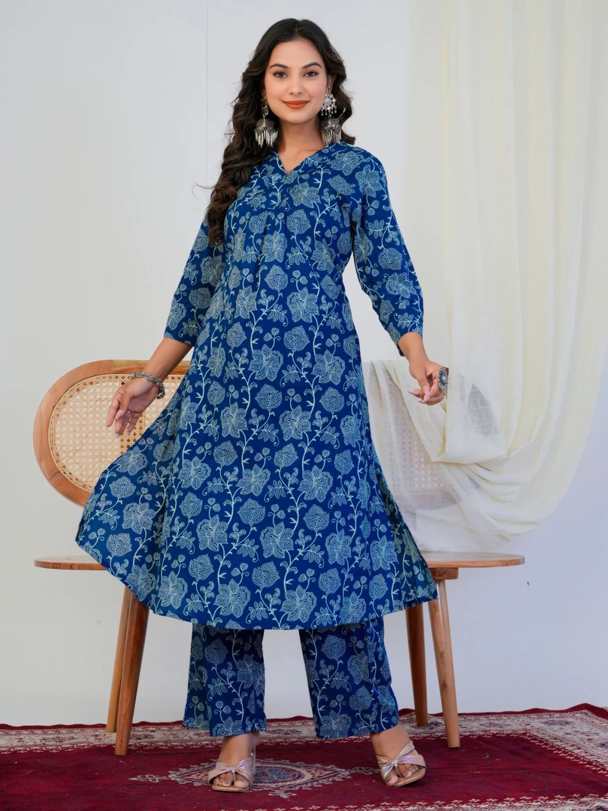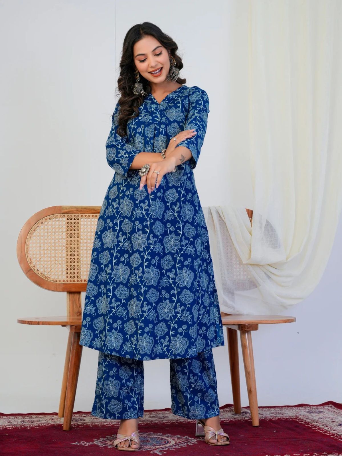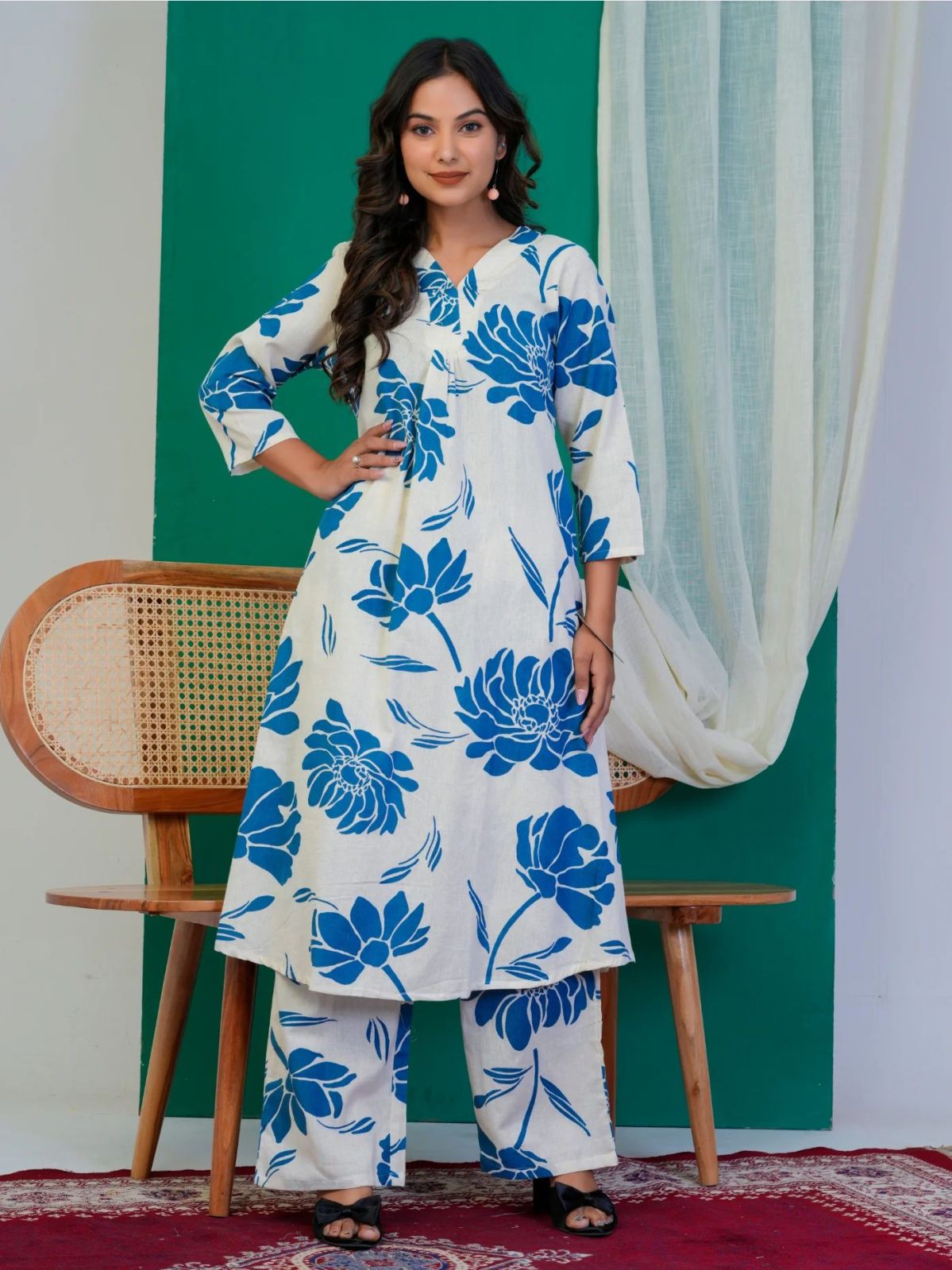 We provide a Navy Blue White Linen Cotton Short Kurta Pant Set in sizes ranging from S to 4XL. This set features an airy linen short kurta with cotton pant, designed for a regular fit. The kurta has 3/4th sleeves, a mandarin collar with 3 wooden buttons, and is made of 20% linen and 80% cotton. The cotton pant is mid-rise and made of 100% cotton. Perfect for formal occasions, this set is ideal for exporters, suppliers, and traders looking for high-quality clothing options.